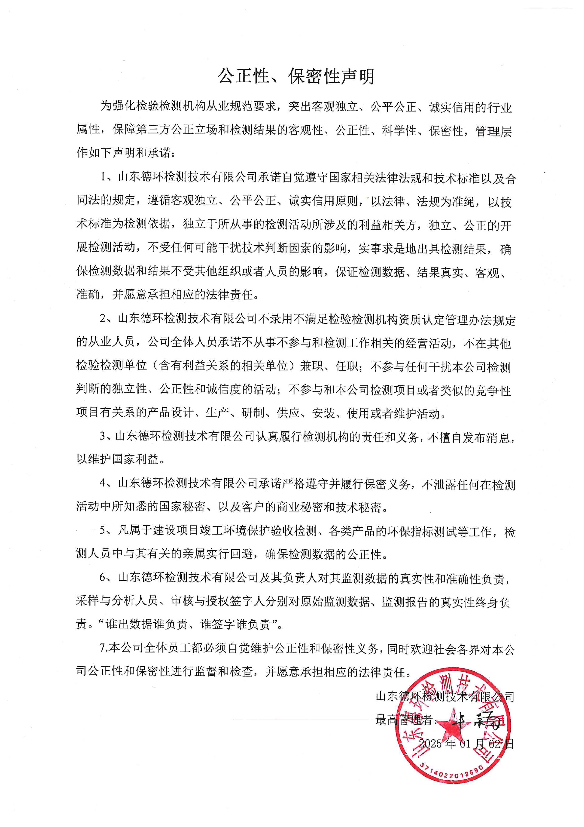 山東德環檢測技術有限公司公正性、保密性聲明
