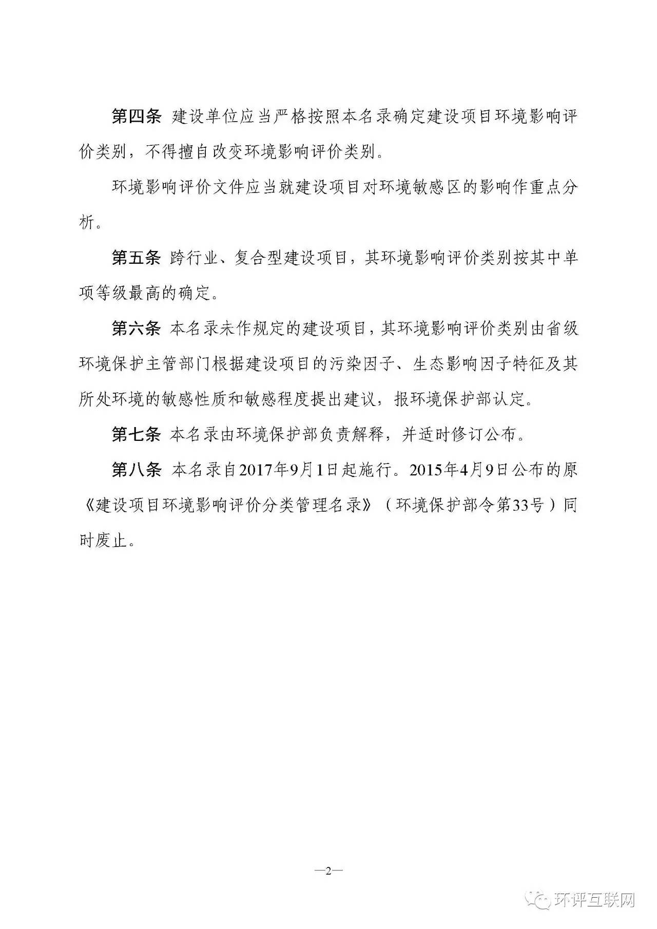 第八條 本名錄自2017年9月1日起施行。2015年4月9日公布的原《建設項目環境影響評價分類管理名錄》(環境保護部令第33號)同時廢止。